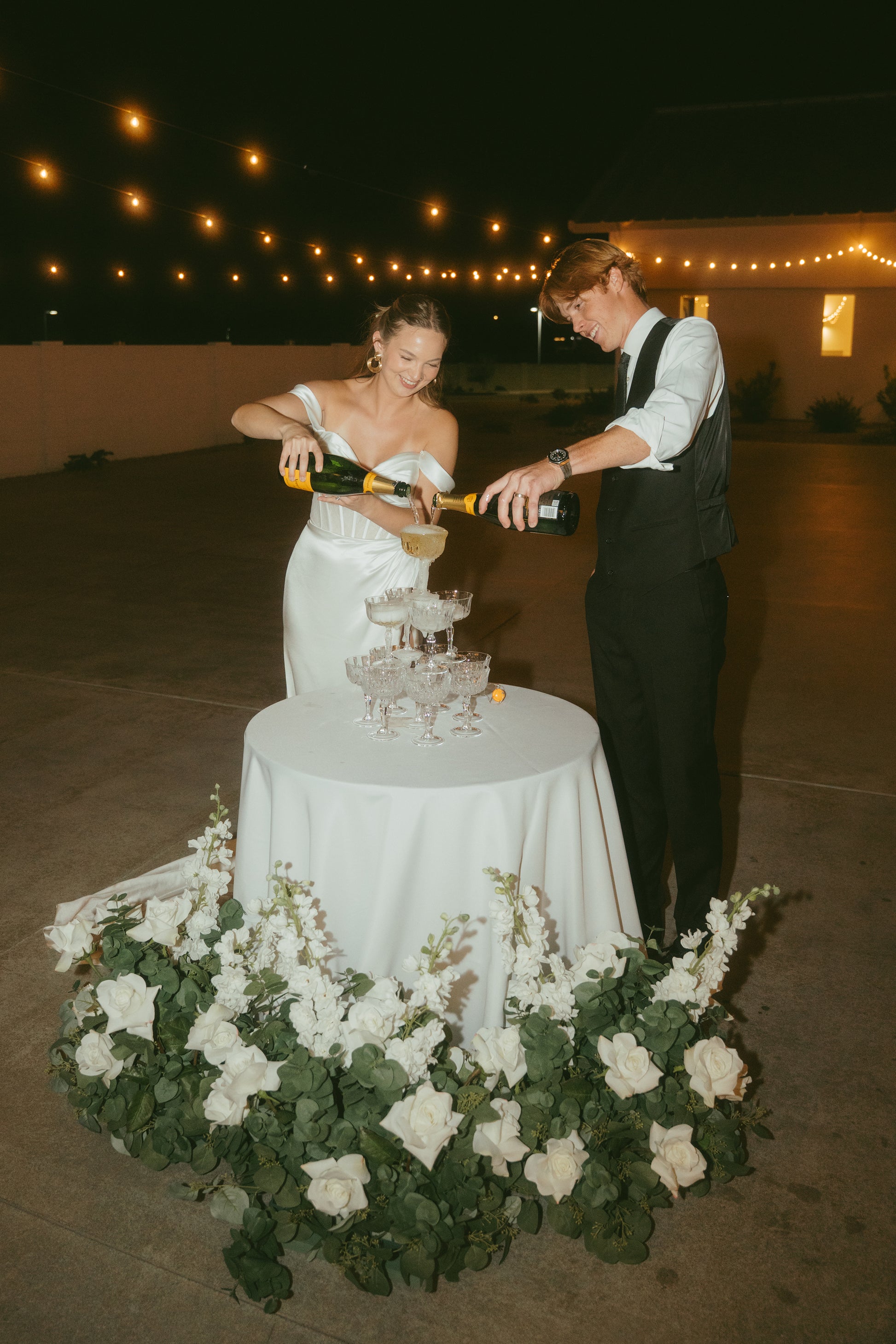 We use a mix of dark green faux eucalyptus greenery with white roses, white delphinium, and white snapdragons silk florals.